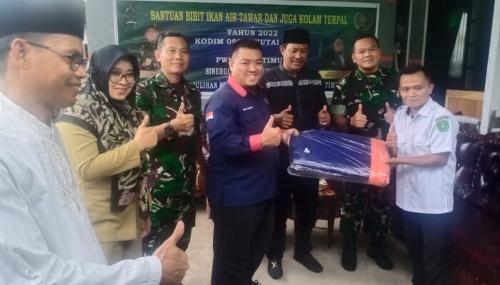HarianKutim.com, Sangatta – Dandim 0909/KTM Letkol CZI Heru Aprianto bersama jajaran pengurus Persatuan Wartawan Indonesia (PWI) Kutai Timur membantu bibit ikan air tawar dan kolam terpal untuk peningkatan ekonomi masyarakat, terkhusus para pemuda karang taruna Dusun Gunung Tehnik Masabang, Desa Sangatta Selatan, kemarin (3/10).