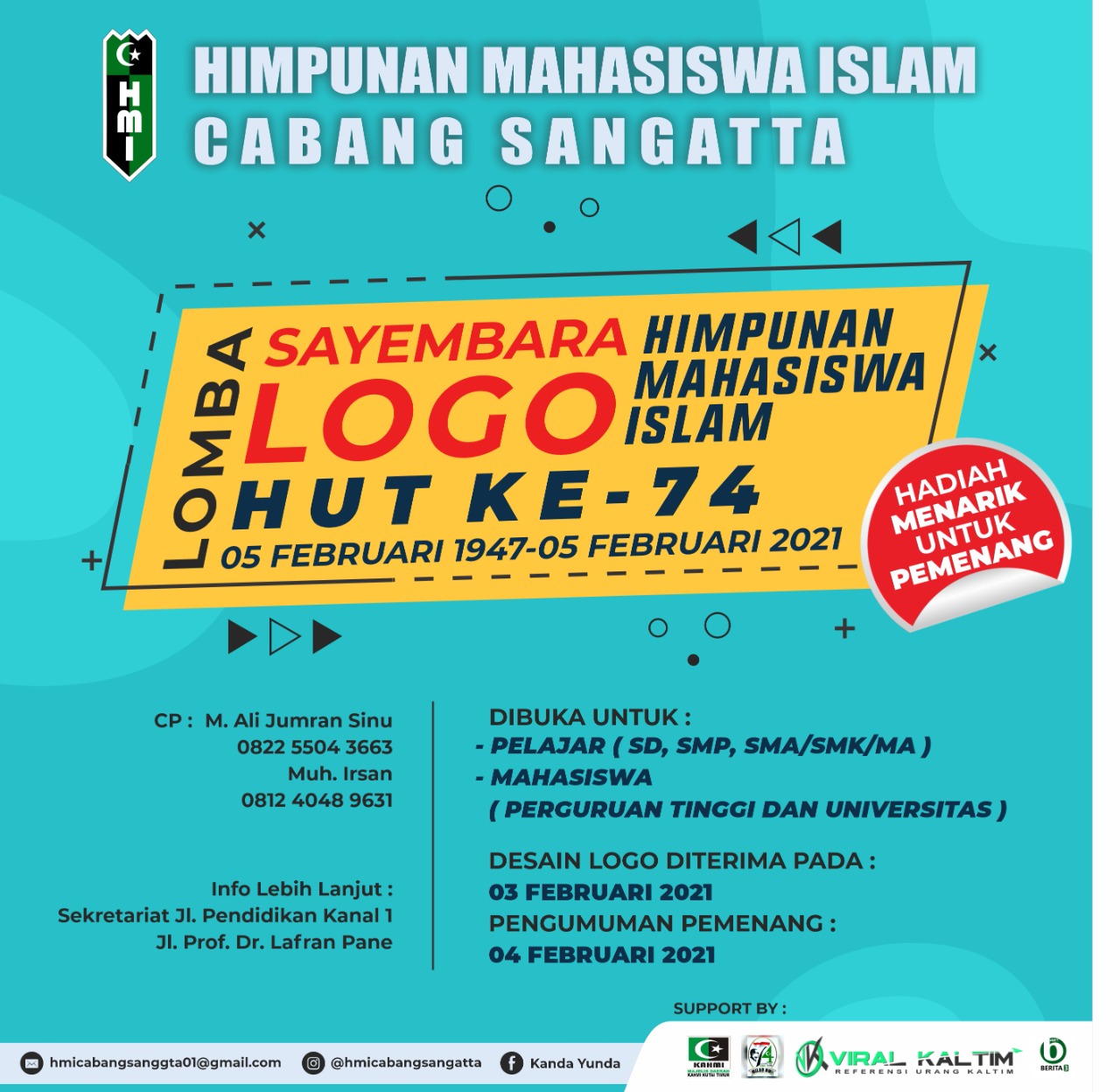 HARIANKUTIM.COM, Sangatta – Dalam Rangka Menyambut Milad ke 74 pada tanggal 5 Februari 2020, Himpunan Mahasiswa Islam (HMI) Cabang Sangatta gelar berbagai kegiatan. Salah satu diantaranya lomba Desain Grafis Logo Milad HMI yang Ke 74 untuk pelajar dan Mahasiswa.