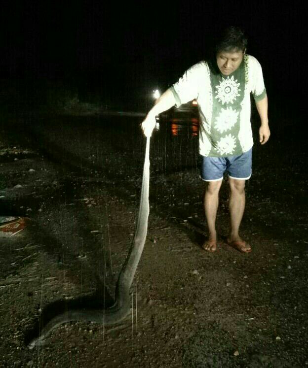 Pukul 23.29 wita akibat hujan deras, terdapat sejumlah titik banjir yang menggenangi jalan poros Dayung, ada ular kesasar di dekat perumahan warga. Tampak salah satu warga, Agus Mulyadi mengamati ular yang cukup besar di saat hujan sudah reda.
