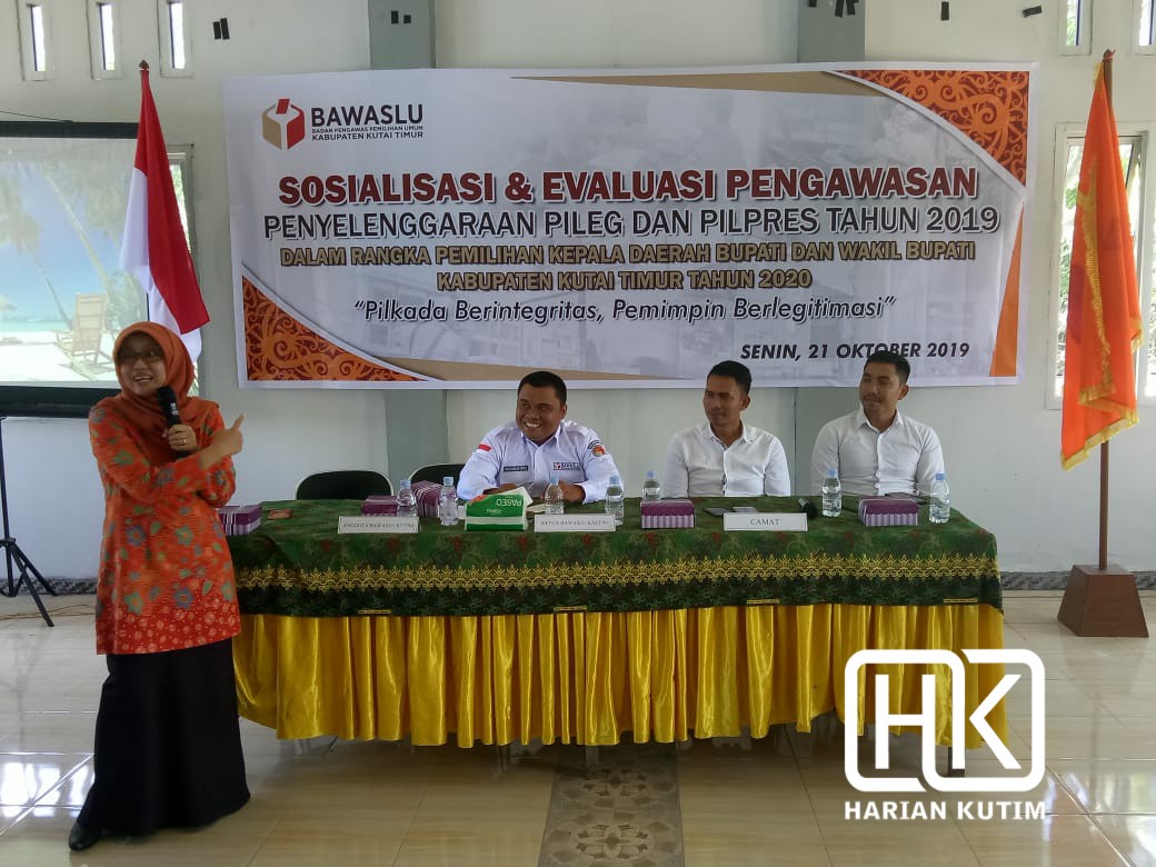 HARIANKUTIM.COM, Teluk Pandan – Ketua Komisi Pemilihan Umum (KPU) Kutai Timur, Ulfa Jamilatul Farida mengisi acara Sosialisasi dan Evaluasi Pengawasan Penyelenggaraan Pileg dan Pilpres Tahun 2019, yang di adakan oleh Bawaslu Kutai Timur, Senin (21/10/2019).