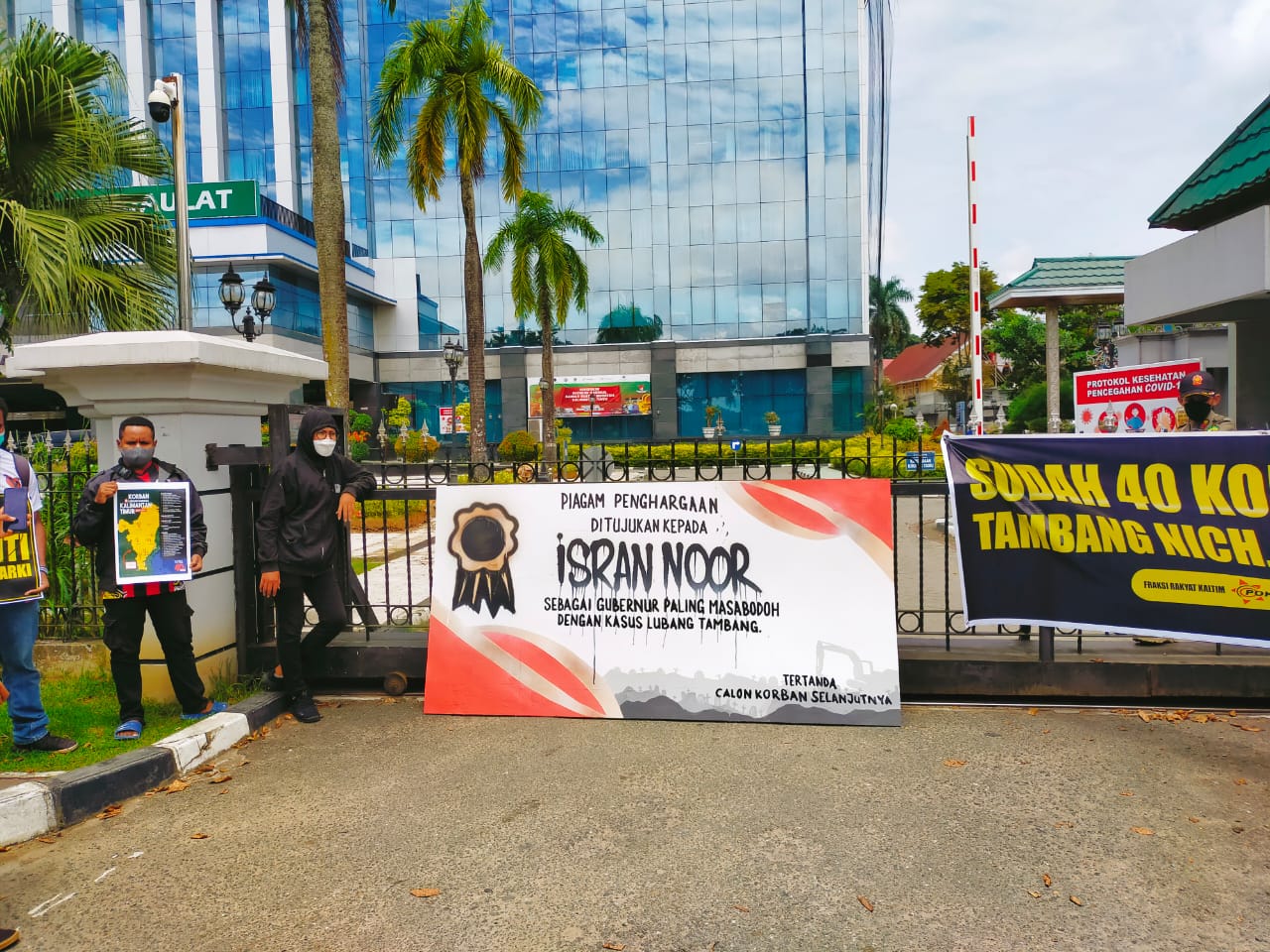 Hal itu dapat dilihat dari spanduk yang diletakkan di depan pintu gerbang Kantor Gubernur Kaltim, bertuliskan “Piagam Penghargaan diberikan kepada Isran Noor sebagai Gubernur Paling Masa Bodoh Dalam Kasus Lubang Tambang”.