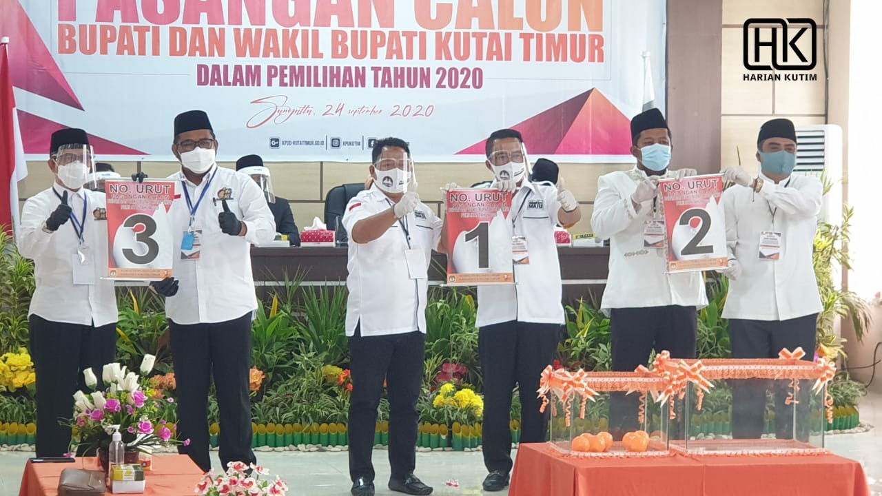 HARIANKUTIM.COM, Sangatta – KPU Kutai Timur melaksanakan rapat pleno terbuka pengundian dan penetapan nomor urut Pasangan Calon (Paslon) yang akan bertarung dalam Pemilu Kepala Daerah (Pilkada) pada 9 Desember 2020 mendatang. Kegiatan ini berlangsung pada Kamis (24/9/2020) pagi tadi, dipimpin langsung Ketua KPU Kutim Ulfa Jamilatul Farida.