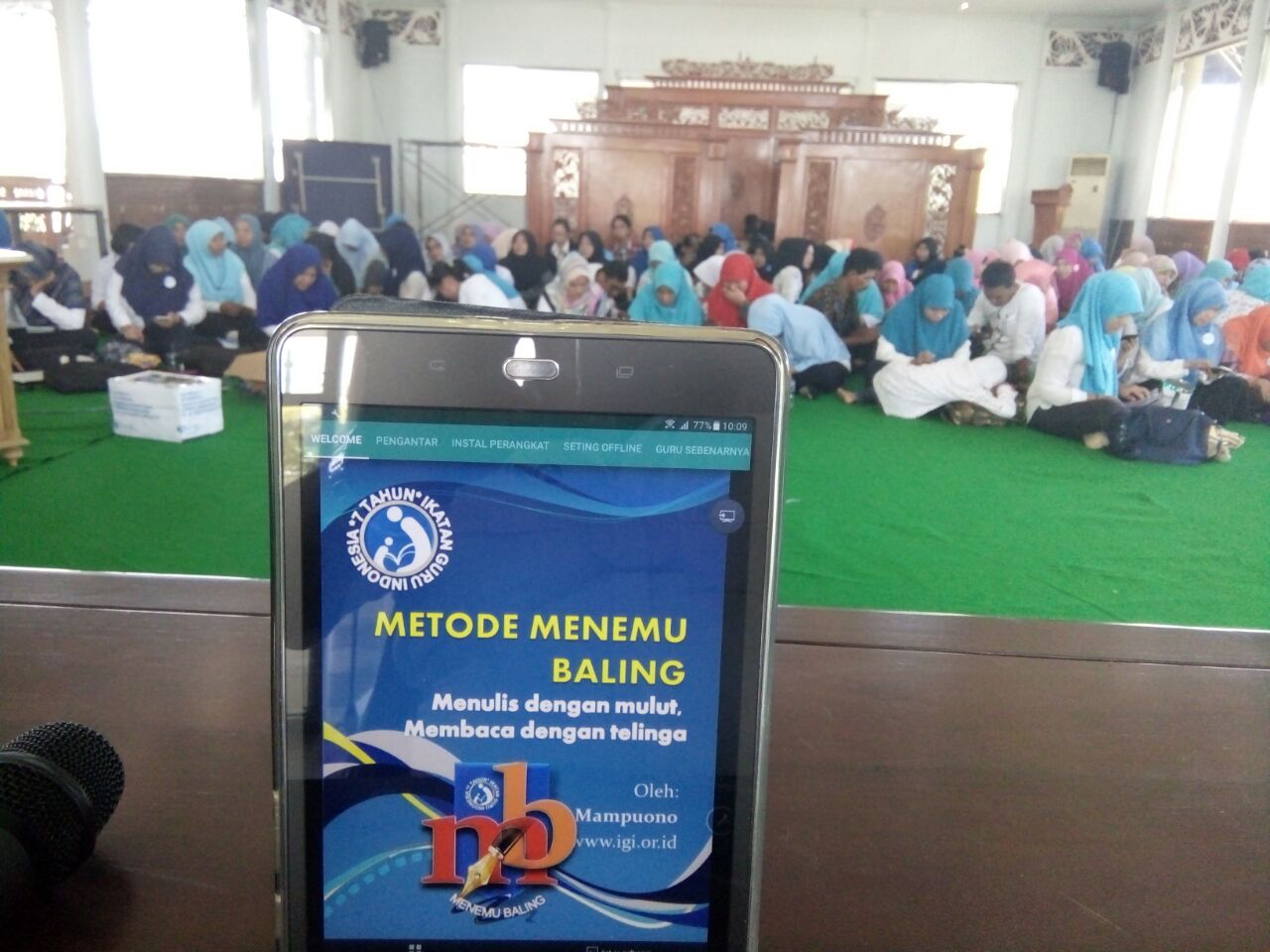 Dalam hal ini pemateri menjelaskan bagaimana cara menginstal aplikasi menemu baling di perangkat tablet yang dimiliki oleh peserta meskipun belum semua peserta memiliki tablet A8 antusiasme mereka tetap tinggi dengan mencoba mendownload aplikasi tersebut pada HP Android mereka masing-masing. Sambil menunggu mereka mendownload aplikasi, pemateri menerangkan bahwa ada 5 langkah dalam menulis yaitu prewriting (pramenulis) yang meliputi brainstorming, listing, dan mind mapping. Langkah selanjutnya yaitu drafting, revising, editing, dan publishing.