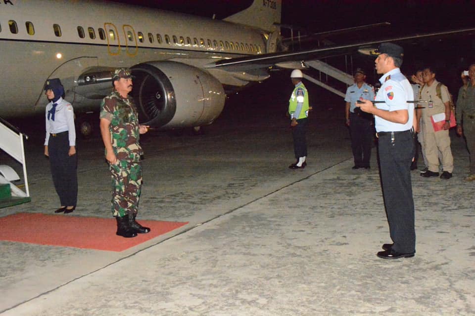 Kedatangan Panglima TNI beserta rombongan di Lanud Jayapura, Sabtu (30/6/2018) disambut oleh Plt. Gubernur Papua Mayjen TNI (Pur) Sudarmo, Pangdam XVII/ Cenderawasih Mayjen TNI George Elnadus Supit, Danrem 172/PWY Kol. Inf Jonathan Binsar Parluhutan Sianipar, para Tokoh Masyarakat dan Tarian Yospan Suku Papua. (Puspen TNI).