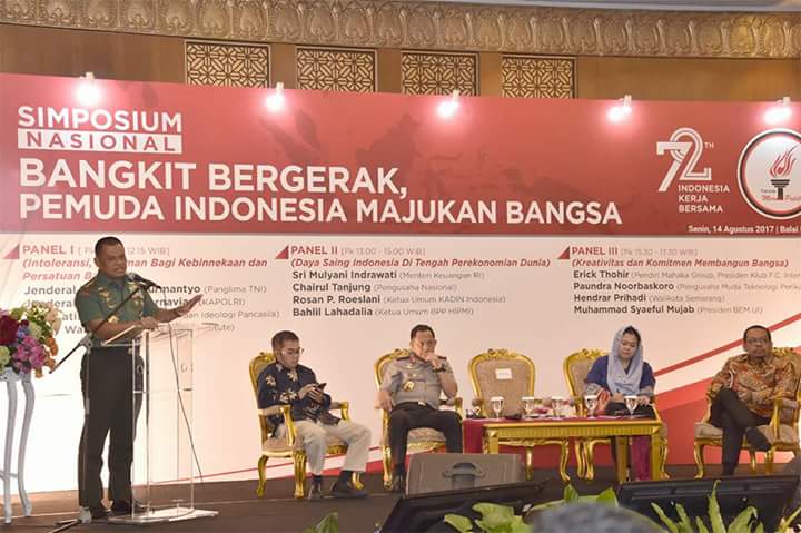 Hal tersebut dikatakan Panglima TNI dihadapan awak media usai memberikan ceramah pada acara Simposium 72 Tahun Kemerdekaan RI dengan tema“Bangkit Bergerak, Pemuda Indonesia Majukan Bangsa”yang dihadiri 603 orang dari Organisasi Pemuda, Ketua Organisasi Siswa Intra Sekolah (OSIS), Badan Eksekutif Mahasiswa (BEM), Relawan dan Aktifis, bertempat di Gedung Mawar Balai Kartini, Jakarta Selatan, Senin (14/8/2017).