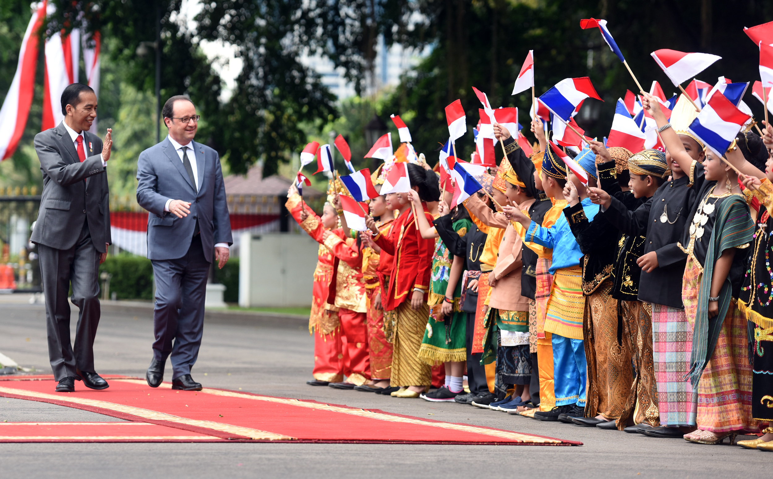 Di halaman Istana Merdeka, Presiden Jokowi menyambut langsung kedatangan Presiden Perancis Francois Hollande. Selanjutnya kedua pemimpin negara menuju halaman Istana Merdeka untuk mengikuti upacara penyambutan kenegaraan, dan memeriksa pasukan kehormatan.