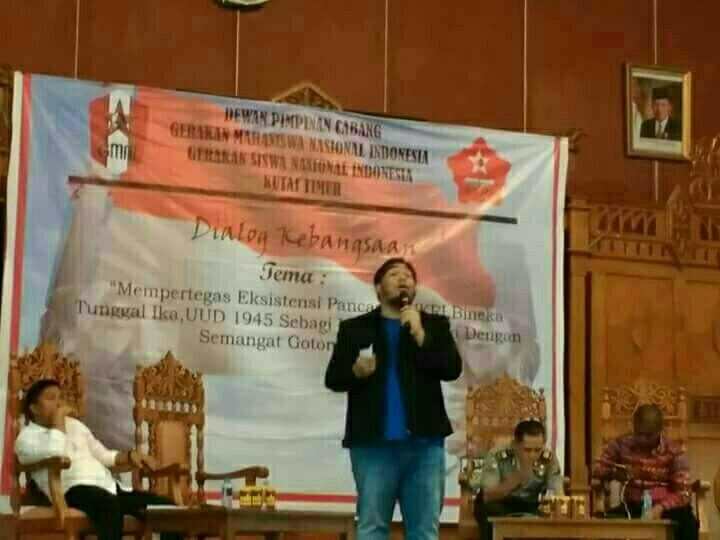 Dialog Kebangsaan dengan tema “Mempertegas Eksistensi Pancasila NKRI Bhineka Tunggal Ika, UUD 1945 Sebagai Ideologi Bangsa Dengan Semngat Gotong Royong” itu dihadiri oleh elemen mahasiswa, siswa, OPD yang ada di pemkab Kutim.