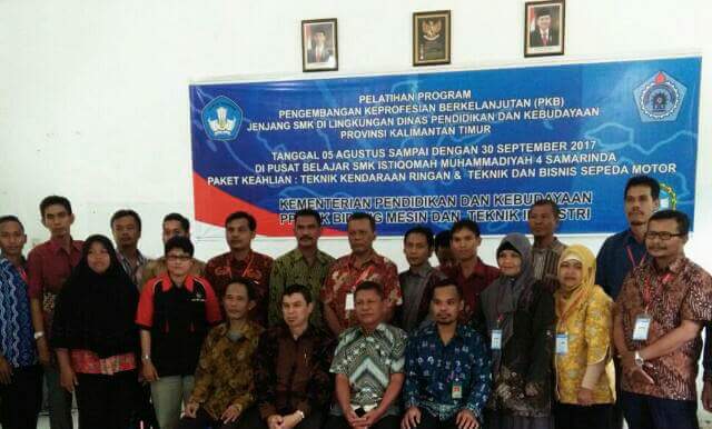 Samarinda, Sabtu 5 Agustus 2017 di SMK Istiqomah Muhammadiyah 4 Samarinda. Ada dua paket keahlian yang di pelatihankan yaitu Teknik Kendaraan Ringan dan Teknik dan Bisnis Sepeda Motor. Hadir Kepala Sekolah SMK Istiqomah Muhammadiyah 4, Ketua Majlis Dikdasmen Propinsi Kaltim, Dinas Pendidikan bagian GTK, Instruktur, Wakil dari P4TK BMTI Bandung, Panitia dan peserta diklat guru SMK se- Kaltim.