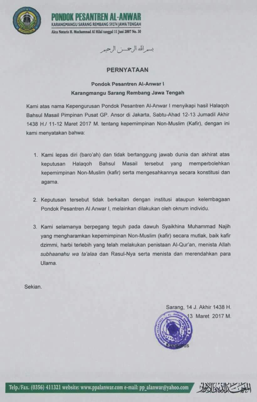 Dalam pernyataannya yang dikutip situs Ponpes al-Anwar, kemarin, pondok pesantren tersebut mengaku tak bertanggung jawab atas keputusan yang memperbolehkan kepemimpinan non-Muslim.
