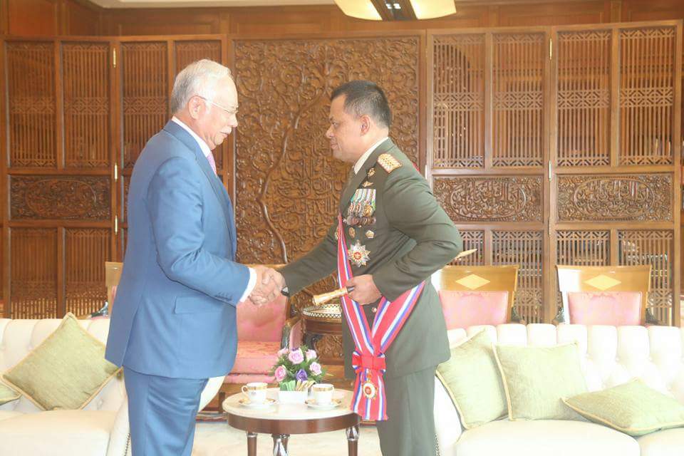 Panglima TNI Jenderal TNI Gatot Nurmantyomenerima penganugerahan Tanda Kehormatan Panglima Gagah Angkatan Tentera (PGAT) dari Kerajaan Malaysia, yangdisematkan langsung oleh Yang Amat Berhormat (YAB) PerdanaMenteri Malaysia, Dato Sri Mohammad Najib bin Tun Abdul Razak di Putra Jaya, Malaysia, Rabu (19/7/2017).