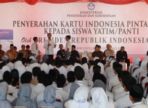 Setelah meresmikan SMAN Taruna Nala, Presiden Joko Widodo (Jokowi) membagikan Kartu Indonesia Pintar (KIP), di SMK Muhammadiyah 7, Gondanglegi, Kabupaten Malang, Sabtu (3/6).