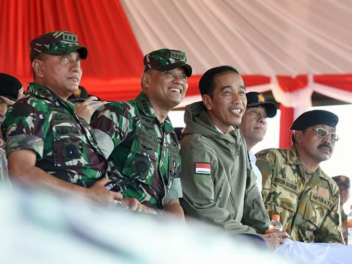 HarianKutim.Com — Presiden RI Ir. Joko Widodo didampingi Panglima TNI Jenderal TNI Gatot Nurmantyo dan para Kepala Staf Angkatan, sangat bangga kepada TNI saat menyaksikan secara langsung Latihan Pasukan Pemukul Reaksi Cepat (PPRC) TNI tahun 2017 yang mengerahkan 5.900 prajurit TNI dan berbagai Alat Utama Sistem Persenjataan (Alutsista) TNI dari AD, AL dan AU, bertempat di Tanjung Datuk, Natuna, Kepulauan Riau (Kepri), Jumat (19/5/2017).