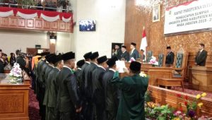 HARIANKUTIM.COM, Sangatta- Rapat paripurna istimewa pengambilan sumpah kepada 40 dewan terpilih pada peroide 2019- 2024. Proses pengambilan sumpah anggota DPRD Kutim Periode 2019-2024 dipandu Ketua Pengadilan Negeri (PN) Sangatta, Rahmat Sanjaya. Disaksikan Bupati Ismunandar, Wabup Kasmidi Bulang serta unsur forkopimda.